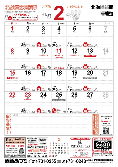 家族の用事や外出予定を書き込めるメモ欄のあるカレンダー。ごみ収集日が一目でわかるアイコン付き。みなさまの楽しい予定でいっぱいになりますように! 2025-12-19