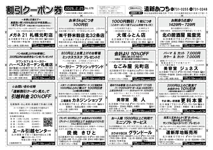 地域の読者向けサービスとして、毎月25日に割引クーポン券を発行しています。理美容室、飲食店、米穀店、ベーカリー、フラワーショップ、ふとん店、眼鏡店、引越センターなど地域の27店で使えるお得なクーポン券で… 2026-2-20