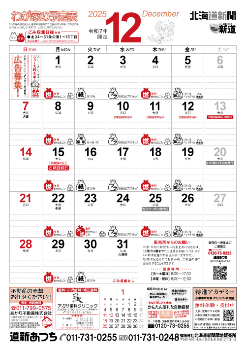 新聞販売店業務コンテンツお知らせ・最新情報新聞配達エリア取扱い新聞折込みチラシ業務読者サービス古紙回収・社会貢献活動割引クーポン券道新ミニコミ新道我が家の予定表北海道新聞社の本会社概要個人情報保護方針Homeご連絡受付けTOP・利用案内新規新聞購読お申込み無料サンプル新聞お申込み配達一時休止・お預かり自動振替のお申し込み求人お問い合わせ転居・引っ越しのご連絡古紙回収お申込みお問い合わせ(新聞業務関連)おすすめ商品最新情報 わが家の予定表12月 発行しました 2025-11-20 我が家の予定表 道新ミニコミ新道685号 発行しました 2025-11-15 道新ミニコミ新道 割引クーポン券10月25日 発行しました 2025-10-25 道新ミニコミ新道