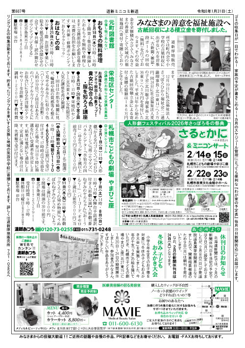 新聞販売店業務コンテンツお知らせ・最新情報新聞配達エリア取扱い新聞折込みチラシ業務読者サービス古紙回収・社会貢献活動割引クーポン券道新ミニコミ新道我が家の予定表北海道新聞社の本会社概要個人情報保護方針Homeご連絡受付けTOP・利用案内新規新聞購読お申込み無料サンプル新聞お申込み配達一時休止・お預かり自動振替のお申し込み求人お問い合わせ転居・引っ越しのご連絡古紙回収お申込みお問い合わせ(新聞業務関連)おすすめ商品最新情報 ミニコミ新道687号 発行しました 2026-1-31 道新ミニコミ新道 割引クーポン券 1月25日 発行しました 2026-1-25 販売店発行割引クーポン 2月の新聞休刊日は、24日(火)です。ご利用ください 新聞お預かりサービス 2026-1-21 お知らせ